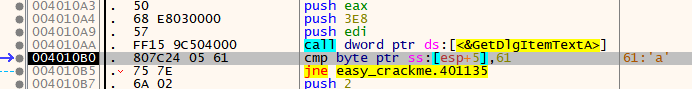 004010AA 수행 직후 이때, 004010AA의 수행 직후 스택에 password로 입력하였던 "mmmmmmmmmm"문자열이 나타난 것을 확인할 수 있었다. GetDlgItemTextA라는 것을 인터넷에 검색해보니 컨트롤에 입력된 텍스트를 얻는 함수로, 004010AA를 기준으로 프로그램에서 이제 입력으로 받은 password에 대한 여러 검사가 진행될 것임을 추측해볼 수 있다. 바로 다음 연산인 004010B0에서 cmp를 통해 값을 비교하고 있다. 어떤 값을 비교하는 것인지 esp+5를 확인해보자.