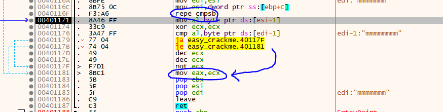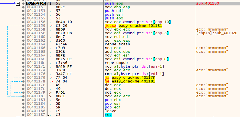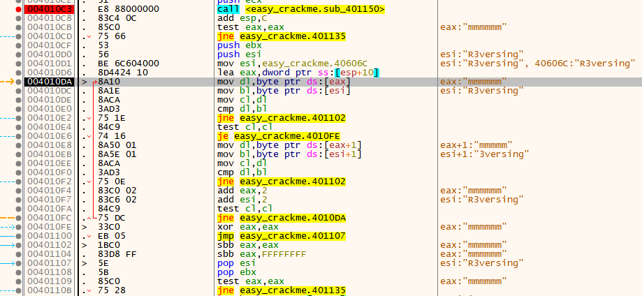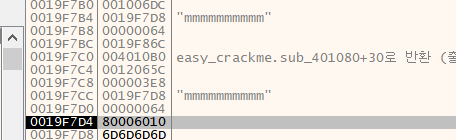 이제 다시 "mammmmmmmm"를 "ma5ymmmmmm"으로 바꿔보고 프로그램을 실행시켜보고, 함수 호출 부분에서 F8을 눌러 eax에 0이 저장되는지 확인해보자.