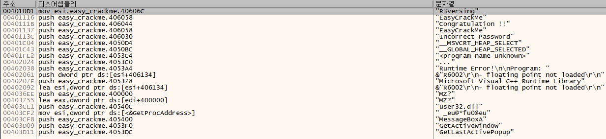 프로그램에서 사용되는 문자열 집합 "Congratulation !!" 문자열을 더블클릭하여 주변을 살펴보기로 하자.