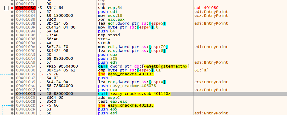 entry point 위로 올리다 보면 sub esp, 64를 통해 스택의 크기를 늘려주고 이후에 esp를 통하여 여러 변수에 접근하는 것을 확인할 수 있다. 00401080에 bp를 설정하고 프로그램을 실행시켜보자.