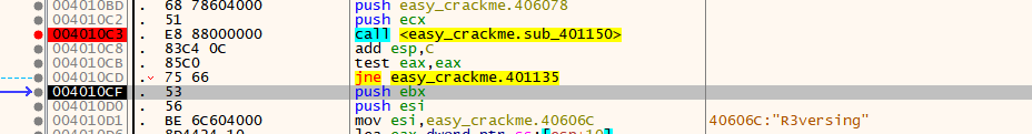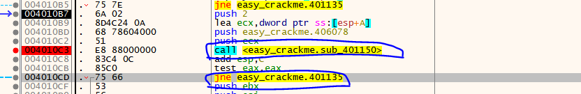 다음 조건 검사 다음 나오는 조건 검사식들을 보아하니, 004010CB에서 test eax, eax를 통해서 eax에 0이 들어있다면 점프를 하지 않고 그렇지 않은 경우 점프를 하게끔 설정되어있다. 점프를 하게 되면 Incorrect password를 출력하는 블록으로 이어지게 된다. 따라서 eax에는 0이 있어야 하는데, 004010C3의 call 함수의 return 값이 eax에 저장될 것으로 추정된다. 위 함수 내부로 들어가서 어떻게 해야 0을 return하는지 확인해 보자.