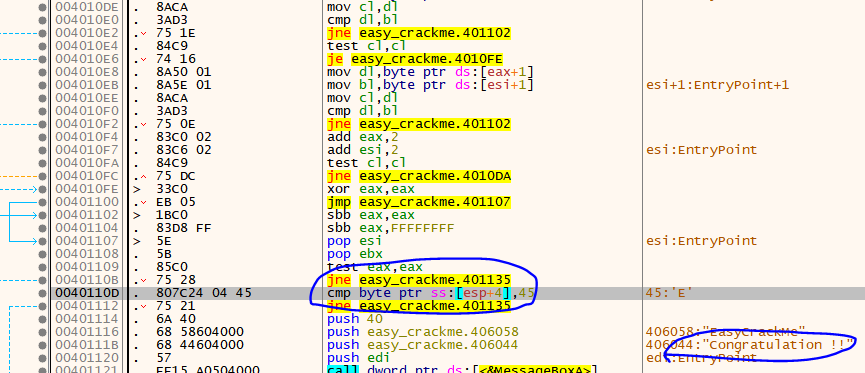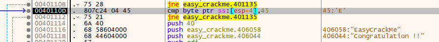 Congratulation 문자열 주변 일단은 congratulaion 문자열 기준으로 위로 코드를 하나씩 살펴보면 동그라미 표시한 esp+4에 있는 값과 'E'(ASCII 0x45)값이 같아야 하는 것을 확인할 수 있다. (같지 않으면 00401112의 jne 연산에 의해 Incorrect 메시지 박스를 호출하는 블록으로 점프한다.) 왠지 암호 중 하나가 E를 포함하고 있어야 할 것 같다. 좀 더 위로 스크롤을 올려보자.