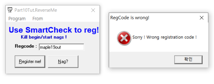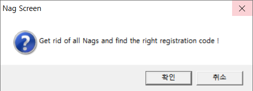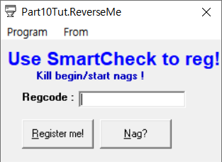실행화면 2 무언가 적합한 Regcode를 발견하여 Register me! 버튼을 눌렀을 때 통과할 수 있는 구조 같다. SmartCheck는 Numega 사에서 만든 크래커들이 자주 이용하는 툴이라고 한다. Nag? 버튼을 클릭해보자.