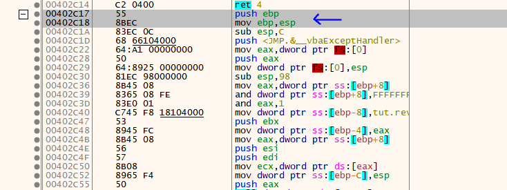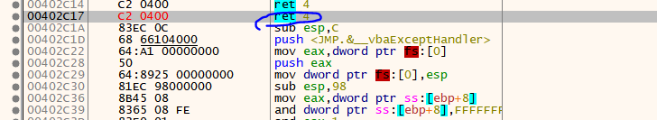 디버깅 4 위와 같이 stack frame을 생성하는 코드를 발견할 수 있다. 따라서 다음과 같이 생각해 볼 수 있다. 어떠한 함수 A가 호출되고, A안에서 MsgBox가 호출된다. 따라서 함수 A가 호출되는 부분에 바로 return을 하게 되면 MsgBox가 호출되지 않을 것이다. stack frame을 생성하는 코드를 다음과 같이 바꿔보자.