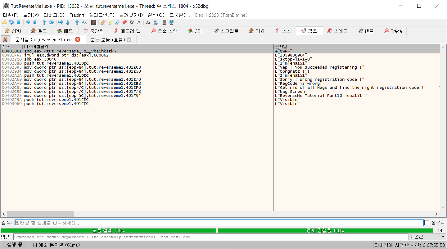 실행화면 4 역시 Wrong registration code !라는 문구를 출력한다. 이제 본격적으로 크랙을 하기 위해 디버깅을 해보자.