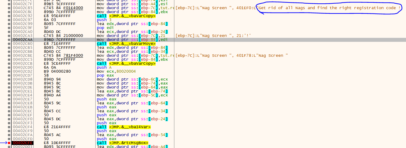 디버깅 3 위와 같이 00402CFE 지점에서 멈췄는데 윗 부분에 "Get rid of all Nags and find the right registration code !"라는 문자열이 있는 것을 확인할 수 있다. 계속 F9를 눌러 실행시켜보면 이전 실행화면과 같은 창이 나타나는 것을 확인할 수 있다. 따라서 00402CFE 지점을 적절히 수정한다면 Get rid of all Nags 이 부분을 달성할 수 있을 것 같다. 먼저 해당 부분을 Call ... 대신 add esp, 14로 스택을 정리하는 형태로 어셈블리 명령어를 수정해보는 접근을 생각해 볼 수 있다. 그러나 이러한 방법은 MsgBox의 return 값이 담기는 eax 레지스터에 대한 처리를 할 수 없으므로 다른 방법을 생각해봐야 한다. 스크롤을 조금 더 올려보자.