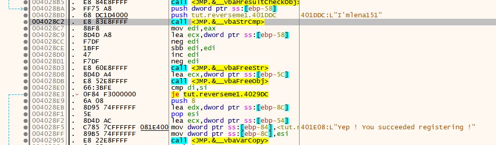 디버깅 7 해당 문자열의 윗부분에 "I'mlena151" 이라는 문자열을 stack에 쌓고 varStrCmp라는 함수를 호출하는 것을 확인할 수 있는데 vbaStrCmp()는 Visual Basic에서 사용자가 입력한 문자열과 대상 문자열을 비교하는 함수이다. I'mlena151을 Regcode로 입력하고 Register me!버튼을 눌러보자.