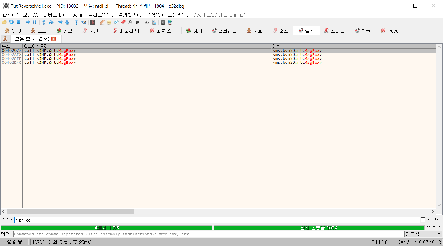디버깅 1 우선 프로그램이 메시지 박스를 출력한다는 점에 착안하여, 메시지 박스 호출 부분을 조작해보자. 마우스 우클릭을 통하여 MsgBox가 호출되는 부분을 검사해보자.