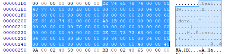 HxD에서 IMAGE_SECTION_HEADER를 살펴보면 다음과 같다. (3개의 섹션이 존재하므로 3 부분이 있다.)