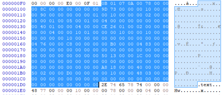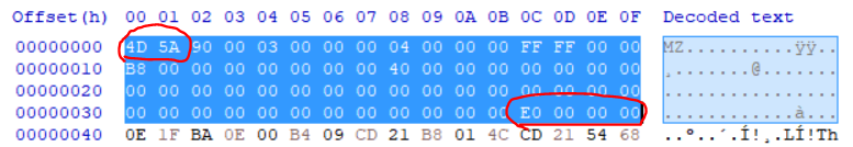 IMAGE_DOS_HEADER MZ의 아스키 값인 4D5A가 e_magic 부분에 나타나고, 000000E0 (little endian임에 주의)가 e_lfanew 값으로 나타나는 것을 확인할 수 있다.