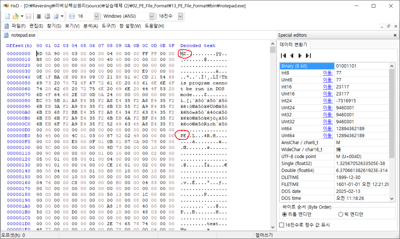 notepad.exe(32bit)을 헥스 에디터 HxD를 이용하여 열어보면 다음과 같다.
