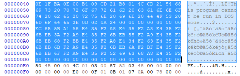 DOS Header 밑에는 DOS Stub이 존재한다. Optional 한 영역으로 없어도 되며 NT Header가 시작되기 이전까지의 영역이다. (없어도 된다고 해서 없애버리면 프로그램이 실행이 안된다...e_lfanew offset을 올바르게 잡아줘도 file 크기를 나타내는 값 등 전체적인 틀이 깨져 다른 멤버의 수정도 필요한 듯하다.) 해당 부분은 DOS용 실행 부분으로, 16bit 어셈블리 명령어로 구성되어 있다. HxD에서 해당 부분을 살펴보면 다음과 같다.