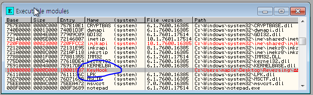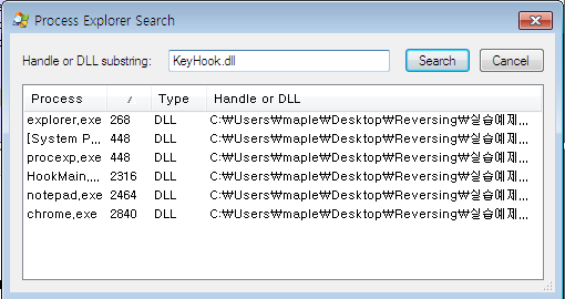 KeyHook.dll 다른 프로세스에서도 마찬가지로 KeyHook.dll이란 파일이 injection 된 것을 확인할 수 있다.