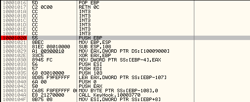 Executable Modules KeyHook.dll을 더블클릭하면 KeyHook.dll의 EP로 간다. 이전에 구한 훅 프로시저 주소인 1001020에 BP를 설정한 후 notepad.exe에서 키보드 입력 이벤트가 발생하면 해당 지점에서 멈춘다.