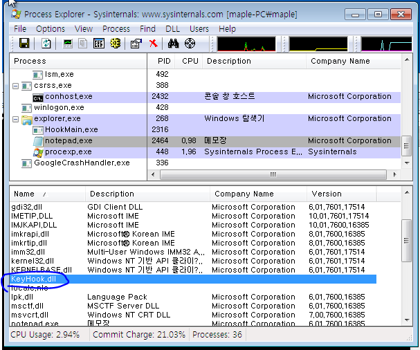 ??? 신기하게도 아무내용도 메모장에 출력되지 않는다. Process Explorer를 통해 살펴보면 아래와 같이 notepad.exe 프로세스에 KeyHook.dll이란 파일이 로딩되어 있는 것을 확인할 수 있다.