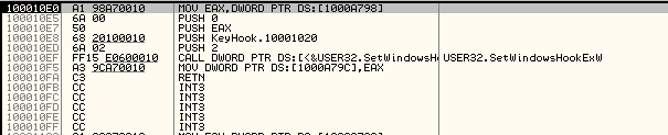 KeyHook.HookStart()함수 위 함수는 KeyHook.dll의 HookStart() 함수다. 100010EF에서 SetWindowHookExW()를 호출하는 것을 확인할 수 있다. 해당 명령어 위로는 차례로 argument를 스택에 쌓는 것을 확인할 수 있다. 그중 첫 번째 argument인 2는 WH_KEYBOARD이며, 두 번째 argument는 Hook Procedure의 주소다.