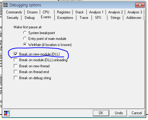 이제 notepad.exe 프로세스 내부에 KeyHook.dll이 들어갔는지 OllyDbg에서 확인해보자. 우선 notepad.exe를 OllyDbg로 연 후, Debugging option에서 다음과 같이 Break on new module(DLL)에 체크 표시를 하자.