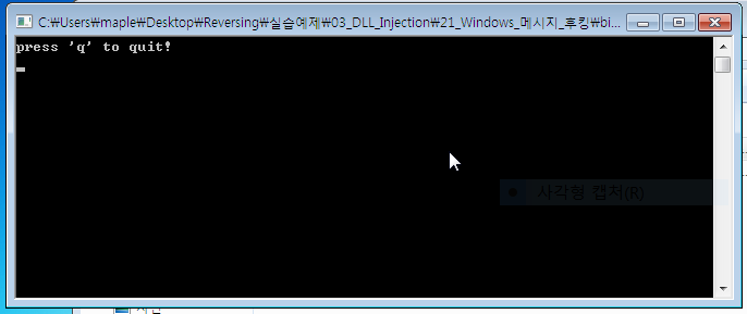 /*** HookMain.cpp ***/ #include <stdio.h> #include <conio.h> #include <Windows.h> #define DEF_DLL_NAME "KeyHook.dll" #define DEF_HOOKSTART "HookStart" #define DEF_HOOKSTOP "HookStop" typedef void(*PFN_HOOKSTART)(); typedef void(*PFN_HOOKSTOP)(); void main() { HMODULE hDll=NULL; PFN_HOOKSTART HookStart=NULL; PFN_HOOKSTOP HookStop=NULL; char ch=0; //KeyHook.dll 로딩 hDll = LoadLibraryA(DEF_DLL_NAME); //export 함수 주소 얻기 HookStart = (PFN_HOOKSTART)GetProcAddress(hDll, DEF_HOOKSTART); HookStop = (PFN_HOOKSTOP)GetProcAddress(hDll, DEF_HOOKSTOP); //후킹 시작 HookStart(); //'q'가 입력으로 들어올 때까지 대기 printf("press 'q' to quit!\n"); while(_getch() != 'q'); //후킹 종료 HookStop(); //KeyHook.dll 언로딩 FreeLibrary(hDll); }KeyHook.dll 파일을 LoadLibrary를 통하여 로딩하고, HookStart() 함수가 호출되면 후킹이 시작되고, HookStop() 함수가 호출되면 후킹이 멈춘다.