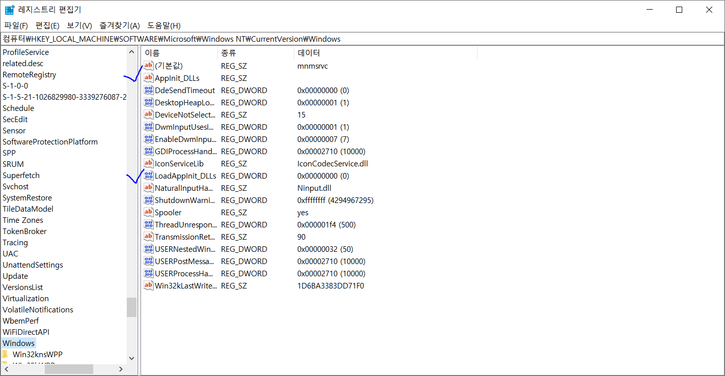 이 방법은 레지스트리(Registry)를 이용한 방법이다. (Windows 10 64bit 환경에서는 적용이 안되어 Windows 7 32bit 환경에서 진행하였다.) Windows 운영체제에서 기본으로 제공하는 AppInit_DLLs와 LoadAppInit_DLLs라는 이름의 레지스트리 항목이 있다.
