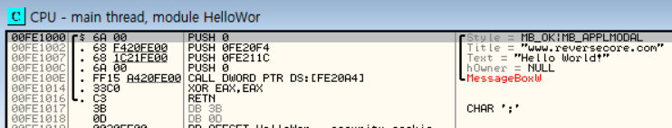 #include "windows.h" #include "tchar.h" int _tmain(int argc, TCHAR *argv[]) { MessageBox(NULL, L"Hello World!", L"www.reversecore.com", MB_OK); return 0; }(HelloWorld.cpp)