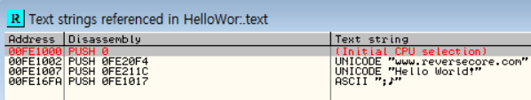 HelloWorld 프로그램에서는 HelloWorld! 라는 문자열을 출력한다. 이에 착안하여 프로그램 내부에서 사용되는 문자열을 검색하면 보다 쉽게 main 함수를 찾을 수 있을 것이다. code창에서 마우스 우클릭->Search for->All referenced text strings를 선택하면 다음과 같은 화면이 나온다.