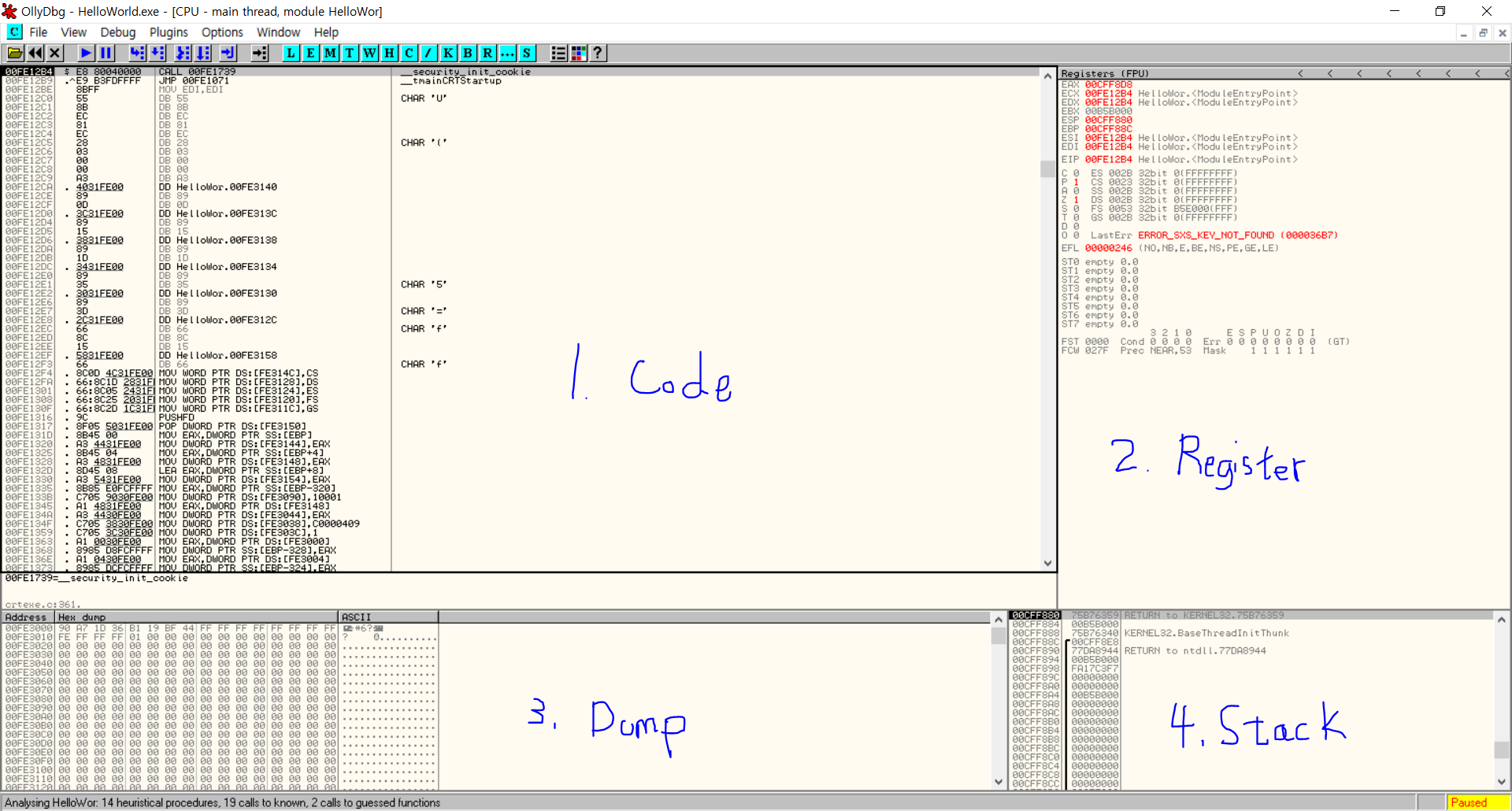 HelloWorld.exe를 연 직후 무언가 굉장히 복잡해 보이지만 크게 4가지 영역으로 나뉘는 것을 확인할 수 있다. 파란 펜으로 표기한 것과 같이 1번 영역은 프로그램의 어셈블리 코드를 나타낸다. 2번 영역은 코드의 진행 시점에서의 register value 및 flag value를 나타낸다. 3번 영역은 Dump 영역으로, data의 ASCII값을 확인할 수 있다. 4번 영역은 stack 영역으로 현재 esp, ebp가 어디에 위치하고 있는지 알 수 있다.