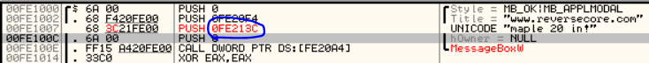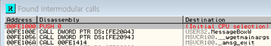 MessageBox API를 이용한 다는 점에 착안하여 어디서 호출되는지를 찾아볼 수도 있다. 마우스 우클릭->Search for->Name in all modules를 통해 프로그램에 사용된 모든 API 호출 목록을 찾아볼 수 있다. 아래 첨부사진과 같이 00FE100E 주소에서 MessageBoxW가 호출됨을 알 수 있다.