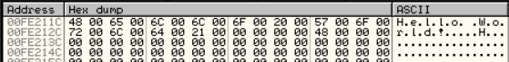 HelloWorld.exe main 위 코드를 보면 알 수 있듯이, "Hello Word!"라는 문자열이 0FE211C라는 주소에 있음을 알 수 있다. Dump창에서 Ctrl+G를 통해 0FE211C로 이동해보면 다음과 같은 창을 확인할 수 있다.
