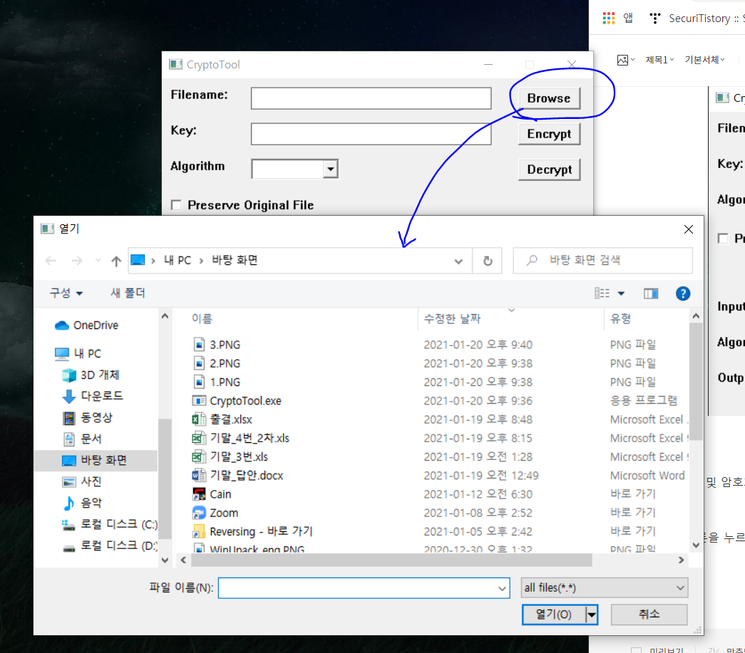 우선 Browse 버튼을 누르면 다음과 같이 파일열기 대화 상자가 나타나도록 구현하였다.