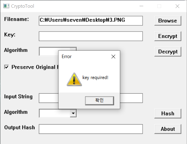 경고 message box 위 예는 Filename을 입력하고 Key를 누락하여 Encrypt 버튼을 눌렀지만 경고 메시지가 나온다.