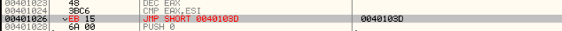 분기하는 조건을 수정하는 방법도 있다. 이후 나오는 명령어인 JE SHORT 0040103D는 ZF(zero flag)가 1인 경우 분기하게 된다. 따라서 ZF가 1이 되도록 CMP EAX, ESI를 CMP EAX, EAX로 변경해주는 방법도 고려해볼 수 있다.