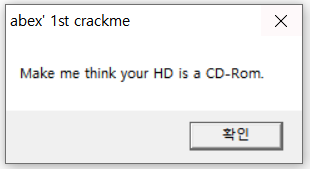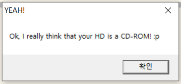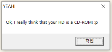 프로그램 실행2 확인 버튼을 다시 누르면 프로그램은 종료가 된다. 첫 번째 캡처 화면에서 보이듯이 HD를 CD-Rom으로 인식하게끔 크랙을 진행해야 함을 유추해 볼 수 있다.