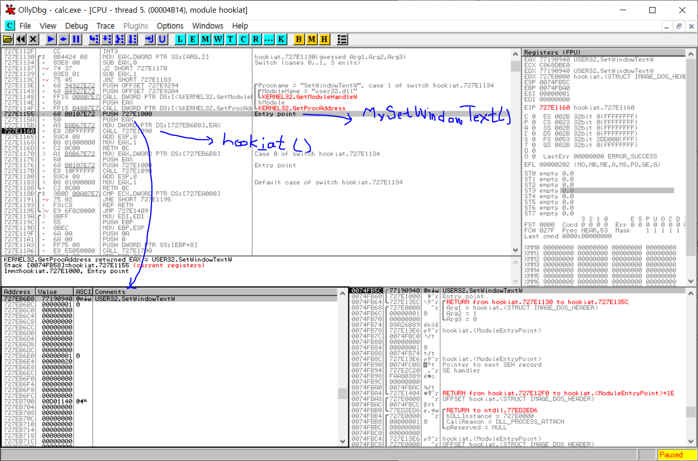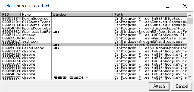 OllyDbg를 이용해 후킹 된 IAT 메모리 영역을 확인해보자. calc.exe를 실행시킨 후, OllyDbg 2.0에 Attach 하자.