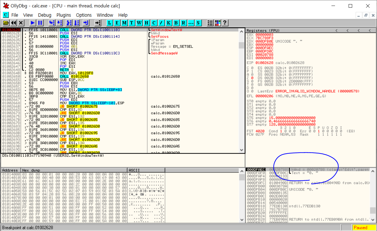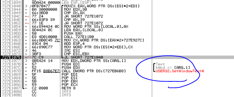 SetWindowText() API BP설정 그리고 난후, F9를 눌러 실행시켜보면 다음과 같이 BP가 적중한다.
