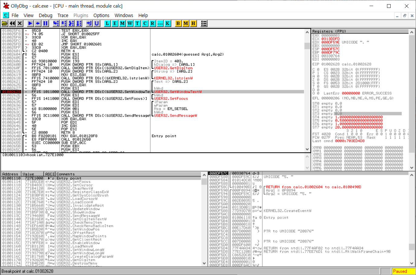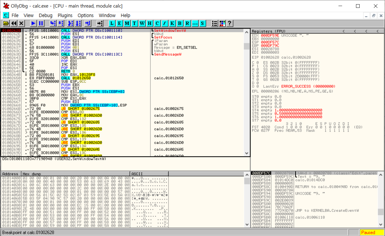 우선 calc.exe를 OllyDbg로 연후, 'Search for All intermodular calls' 명령을 이용해 SetWindowText() API를 호출하는 부분을 찾고 BP를 설정한다.