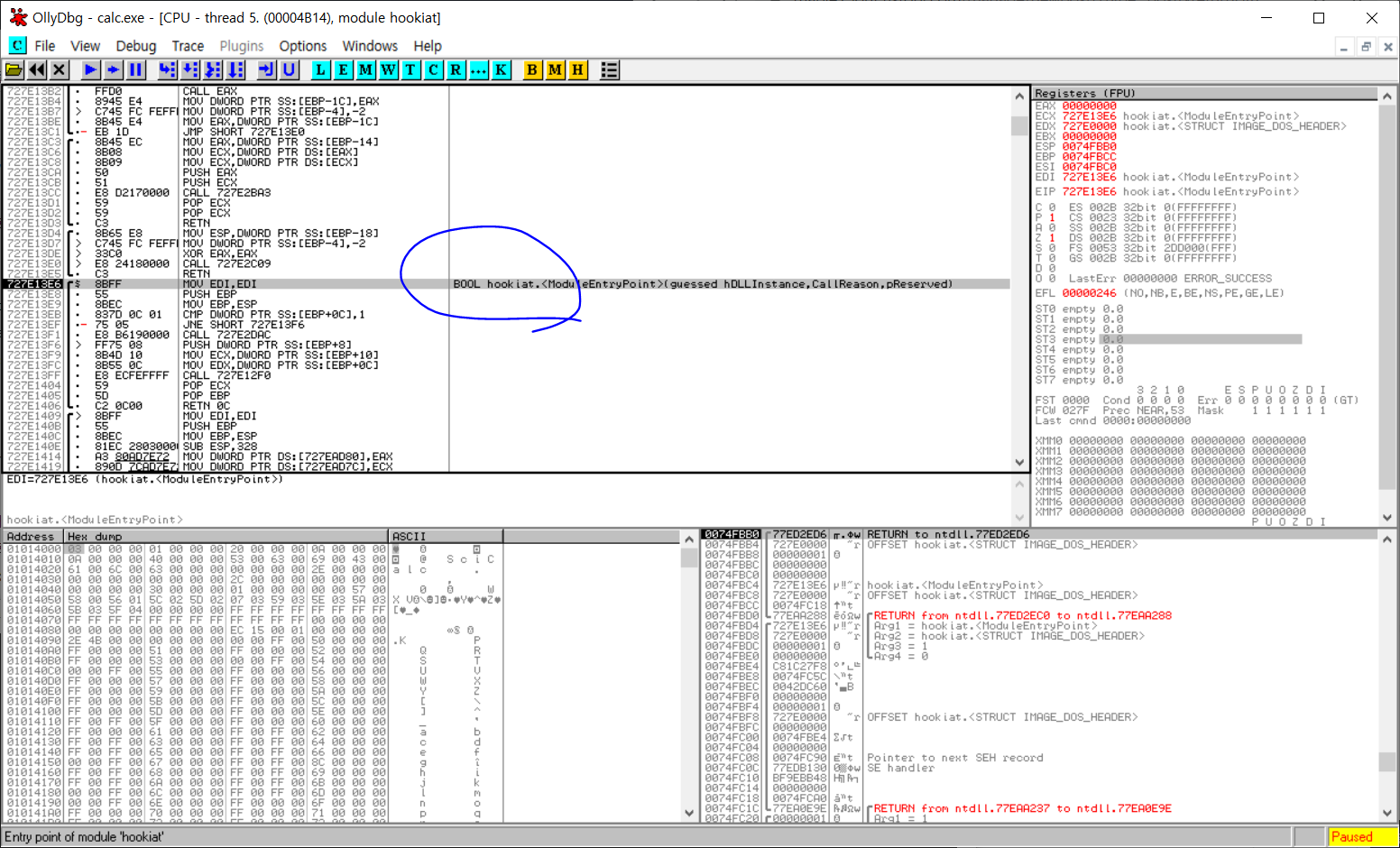 calc.exe attach 이후에 Option에서 Pause on new module을 체크한 후, Dll 인젝션을 하면 아래와 같이 hookiat.dll의 module entry point에서 멈추게 된다.