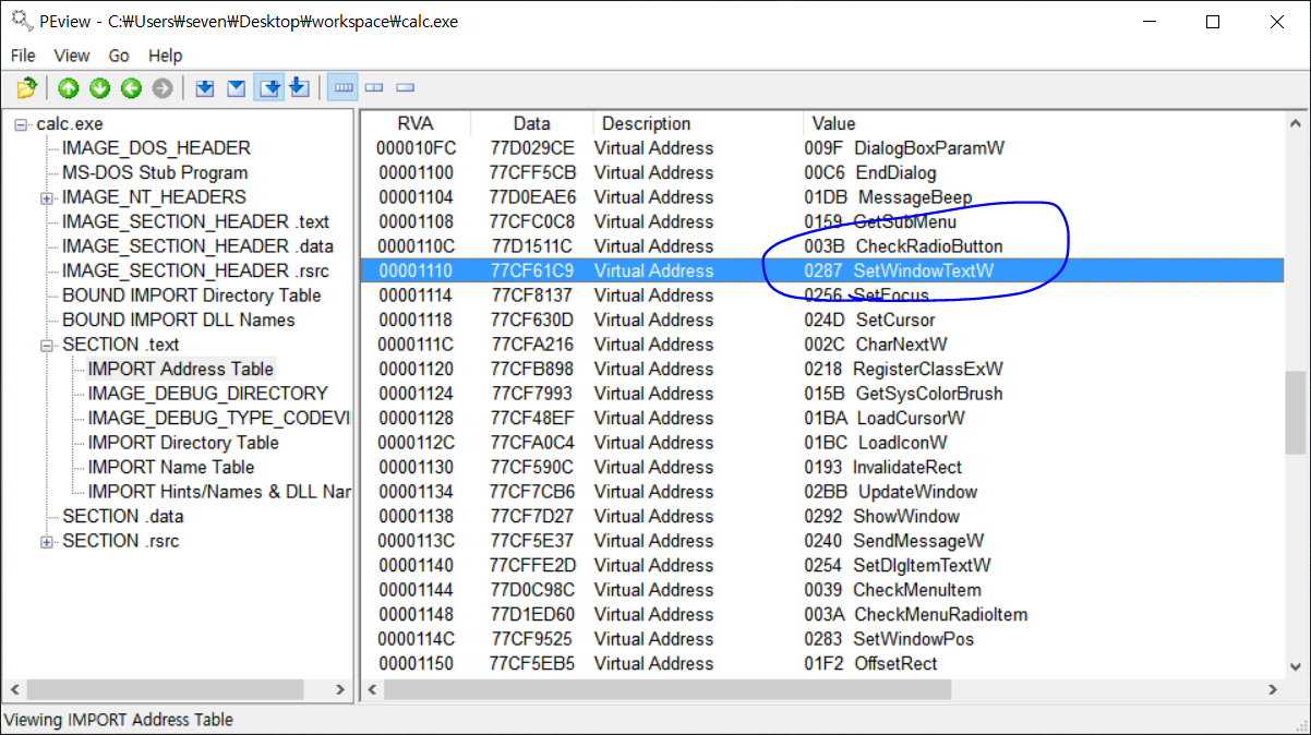 PEView를 통해 calc.exe에서 임포트하는 API들을 확인해보자.