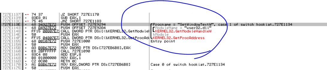 hook_iat 호출 위와 같이 CALL 727E1090 이전에 스택에 쌓인 argument들을 확인해보면 각각 MySetWindowText()와 SetWindowText() API 주소임을 확인할 수 있다. ("user32.dll" 문자열 주소는 코드 최적화에 의해 하드 코딩되며 따로 넘어가지 않는다.) F7을 통해 hook_iat 내부로 들어가 보자.