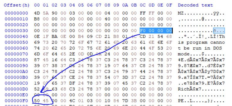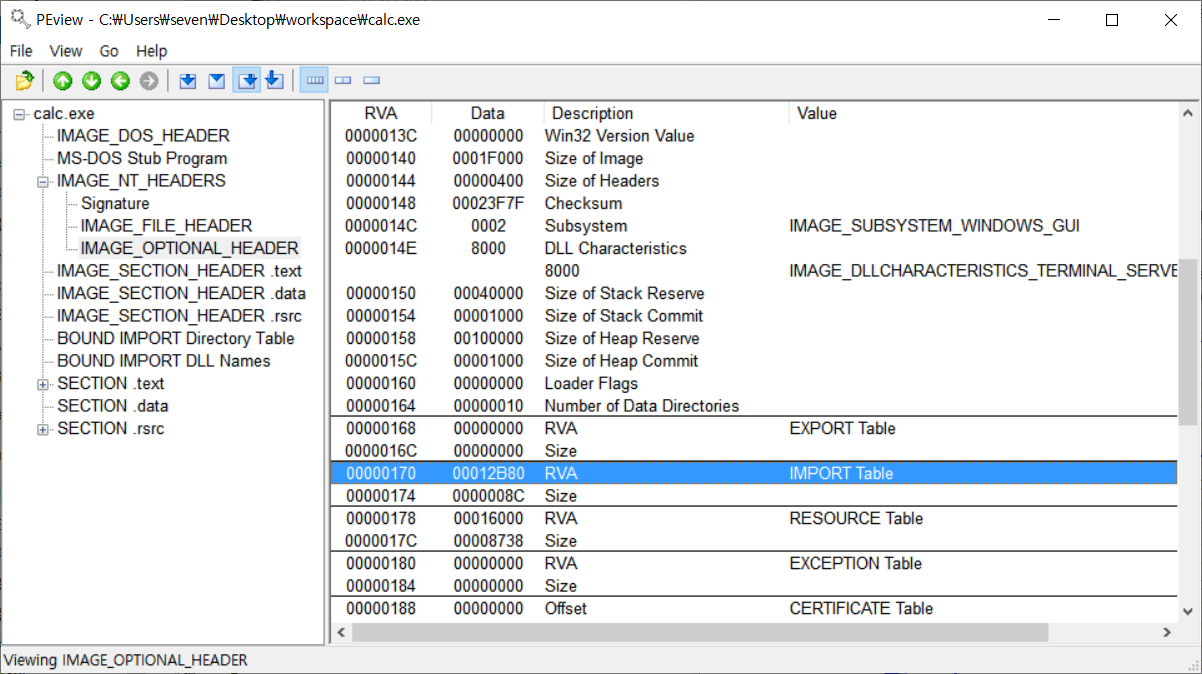 calc.exe HxD 위와 같이 0x3C에는 IMAGE_DOS_HEADER의 e_lfanew 멤버, 즉 NT header로의 offset이 저장되어 있고 해당 부분을 pAddr에 더해주면 PE signature까지의 Virtual Address가 pAddr에 저장되게 된다. 이후에 같은 방식으로 현재의 pAddr로부터 0x80에 저장되어 있는 값을 더해주게 되는데 이번에는 PEView로 해당 부분을 살펴보자.
