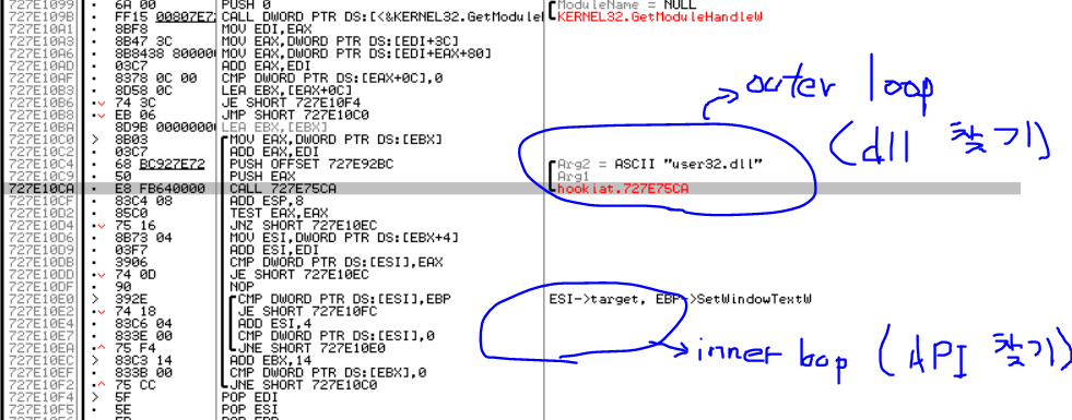 hook_iat 내부 조금 내려보면 위와 같은 형태로 이중 반복문 구조를 나타내는데 소스코드와 같이 Outer loop에서는 IID.Name 항목 중 "user32.dll"을 갖는 부분을 찾고, inner loop에서는 SetWindowText() API 주소와 같은 값을 갖는 부분을 찾는다.