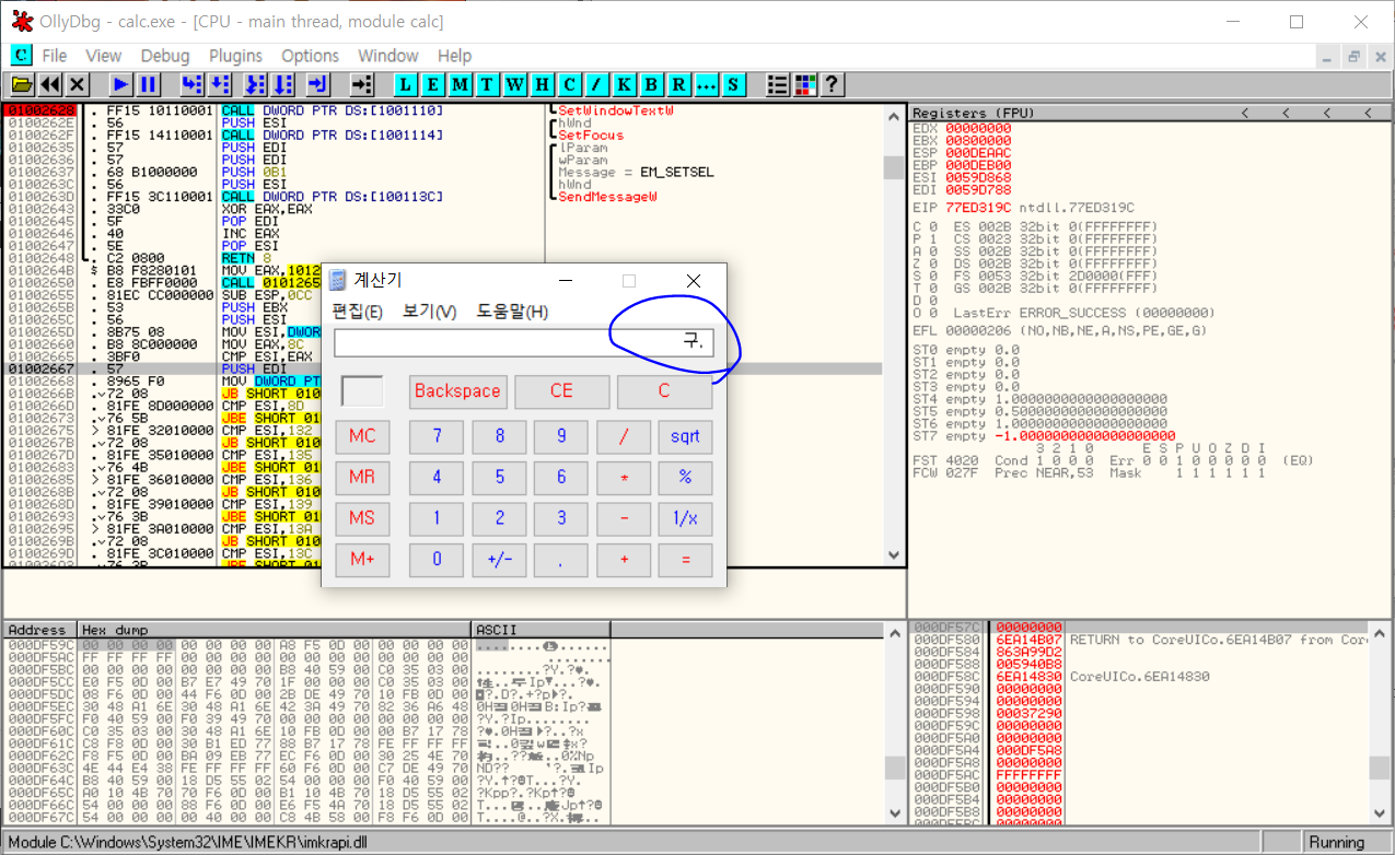 BP 적중 마찬가지로 BP가 적중하며, 이 때의 lpString에는 9.이 저장되어 있는 것을 확인할 수 있다. 이제 lpString이 저장된 위치로 가서 '구'의 유니코드인 AD6C로 아래와 같이 값을 편집해보고 F9를 눌러 실행해보자.
