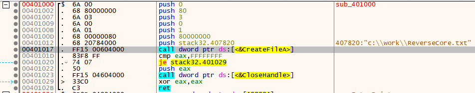 #include "stdio.h" #include "windows.h" void main() { HANDLE hFile = INVALID_HANDLE_VALUE; hFile = CreateFileA("c:\\work\\ReverseCore.txt", // 1st - (string) GENERIC_READ, // 2nd - 0x80000000 FILE_SHARE_READ, // 3rd - 0x00000001 NULL, // 4th - 0000000000 OPEN_EXISTING, // 5th - 0x00000003 FILE_ATTRIBUTE_NORMAL, // 6th - 0x00000080 NULL); // 7th - 0x00000000 if( hFile != INVALID_HANDLE_VALUE ) CloseHandle(hFile); }코드 내용 자체는 간단히 CreateFile() API를 호출하는 코드다.
