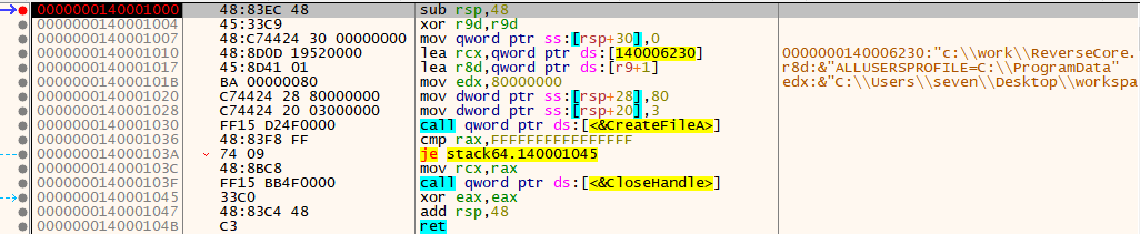 stack64.exe main 우선 스택 프레임 부분을 보면 코드 시작 전에 sub rsp, 48을 통해 스택을 늘리고, ret 전에 add rsp,48을 통해 스택을 해제하는 것을 볼 수 있다. 또한 argument를 넘길 때 레지스터를 이용하고 앞에서 4개를 넘어서는 경우 mov 연산을 통해 늘어난 스택에 넘겨주는 것을 확인할 수 있다. 이때 넘어가는 5번째 argument는 [rsp]가 아닌 [rsp+20]에 저장되는 것을 확인할 수 있는데, 앞의 4개의 argument를 위한 공간을 스택에 예약하는 특징이 있기 때문이다. CreateFileA() API 내부로 들어가도 마찬가지의 형태를 보인다.