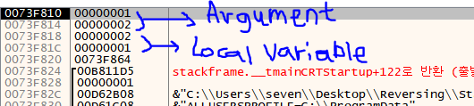 스택 창. local variable과 argument가 들어간 것을 확인할 수 있다.