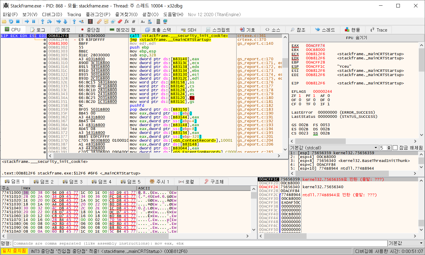 EBP, ESP 변화 위와 같이 Stack Frame이 정상적으로 생성되었음을 확인할 수 있다.