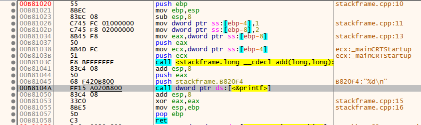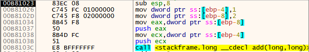 #include "stdio.h" long add(long a, long b) { long x=a, y=b; return (x+y); } int main(int argc, char* argv[]) { long a=1, b=2; printf("%d\n", add(a, b)); return 0; }(StackFrame.cpp)
