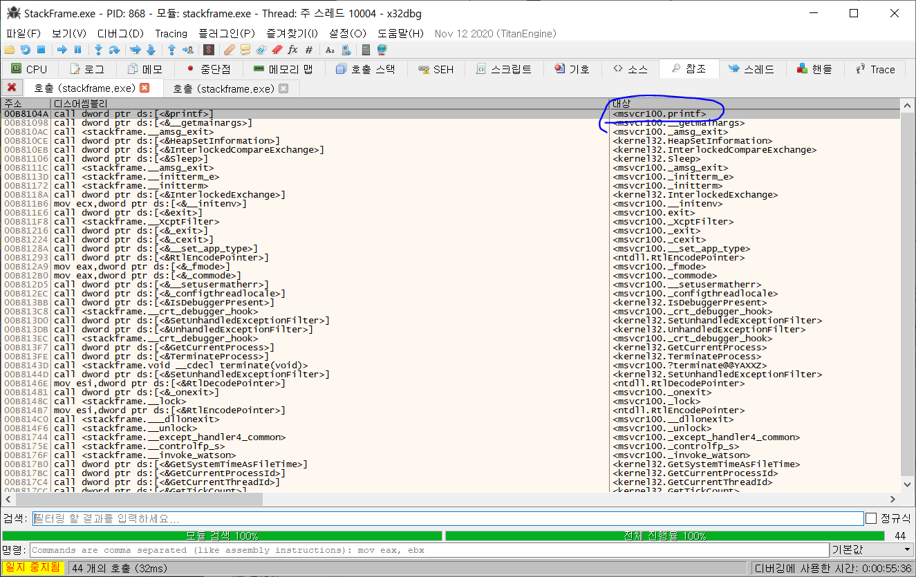 StackFrame.exe의 초기 디버깅 화면 cpp 파일은 몇 줄 안되는데 언제나처럼 굉장히 많은 코드 정보가 눈에 들어온다. F7, F8을 연타하여 main 함수를 찾아낼 수도 있겠지만, 보다 수월하게 찾는 방법을 생각해보자. 다양한 방법이 있겠지만, printf 함수를 main에서 호출하므로 마우스 우클릭-> 모듈 간 호출을 통해 한번 찾아보자.