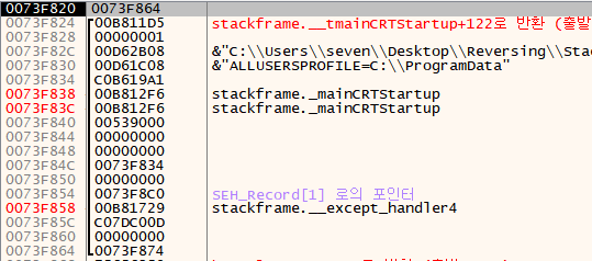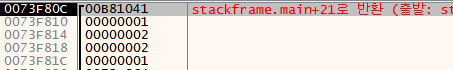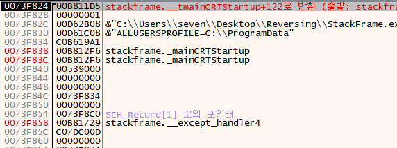 Stack Frame의 어셈블리 코드 부분은 다음과 같다.