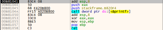 add 함수 호출 이후 main 함수 가장 상단 부분의 add esp, 8은 함수의 호출이 끝났으니, 사용했던 argument는 더 이상 필요가 없으므로 스택에서 제거해주는 과정이다. StackFrame.cpp에서는 이후에 printf 함수를 호출하므로 add 함수를 호출하는 과정과 마찬가지로 eax(add 함수의 반환 값)과 B820F4 주소(서식 문자 %d가 있다.)를 push 해주고 printf함수를 호출한다. 마찬가지로 add esp, 8을 통해 스택에 쌓아두었던 argument를 해제해준다.