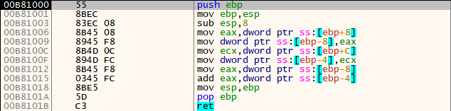 위와 같이 함수가 호출되면 stack frame이 먼저 생성되고 ebp 레지스터를 이용해 각종 변수/파라미터에 접근한 후, 함수가 종료되기 직전에 stack frame을 해제하는 것을 확인할 수 있다.